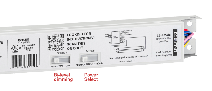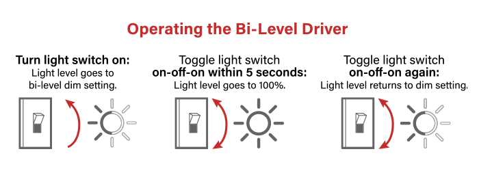 The driver-based bi-level dimming allows installers to select a baseline brightness of 50%, 70%, or 100% using easily selectable dip switches on the driver. Once installed, end users can toggle between full brightness and the selected level simply by switching the wall switch off and on within five seconds. This makes the system ideal for spaces where lighting needs vary throughout the day.